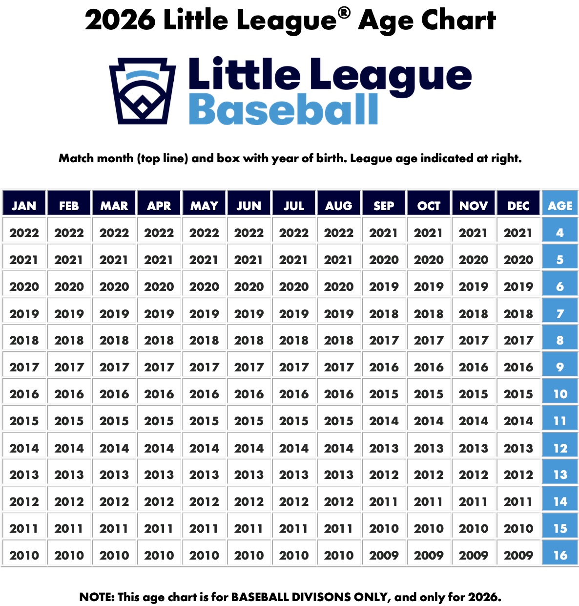 Baseball age is an age categorization set by Little League International. LL baseball age is the age your child will be as of August 31, 2026. This means that some kids will have a higher baseball age than their actual current age. See the 2026 Little League Age Chart.